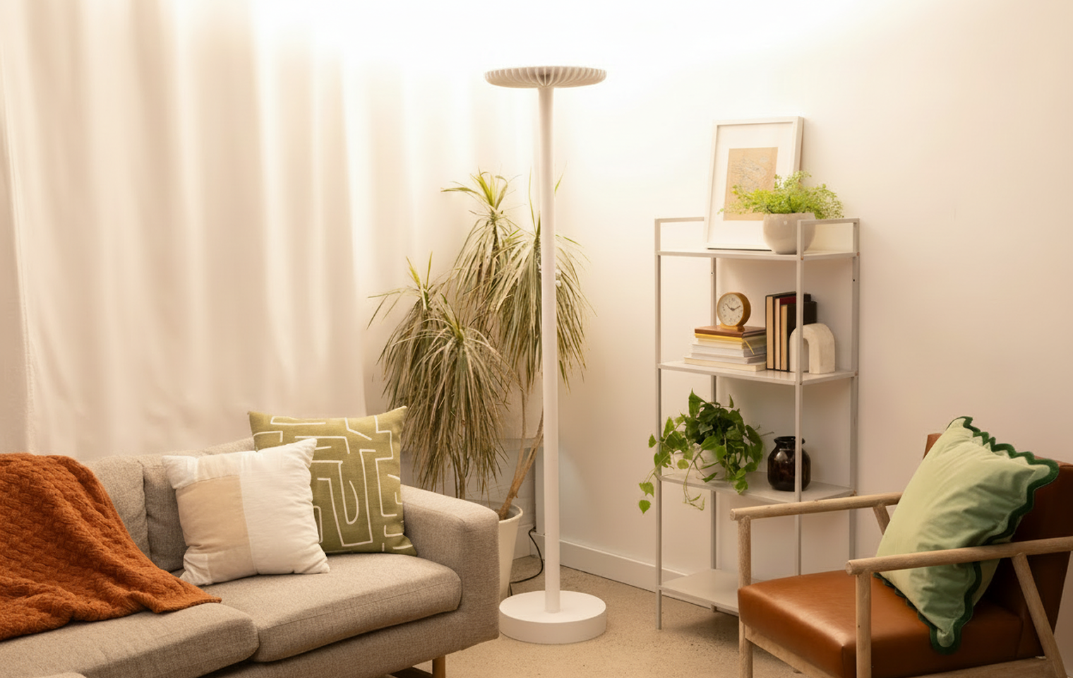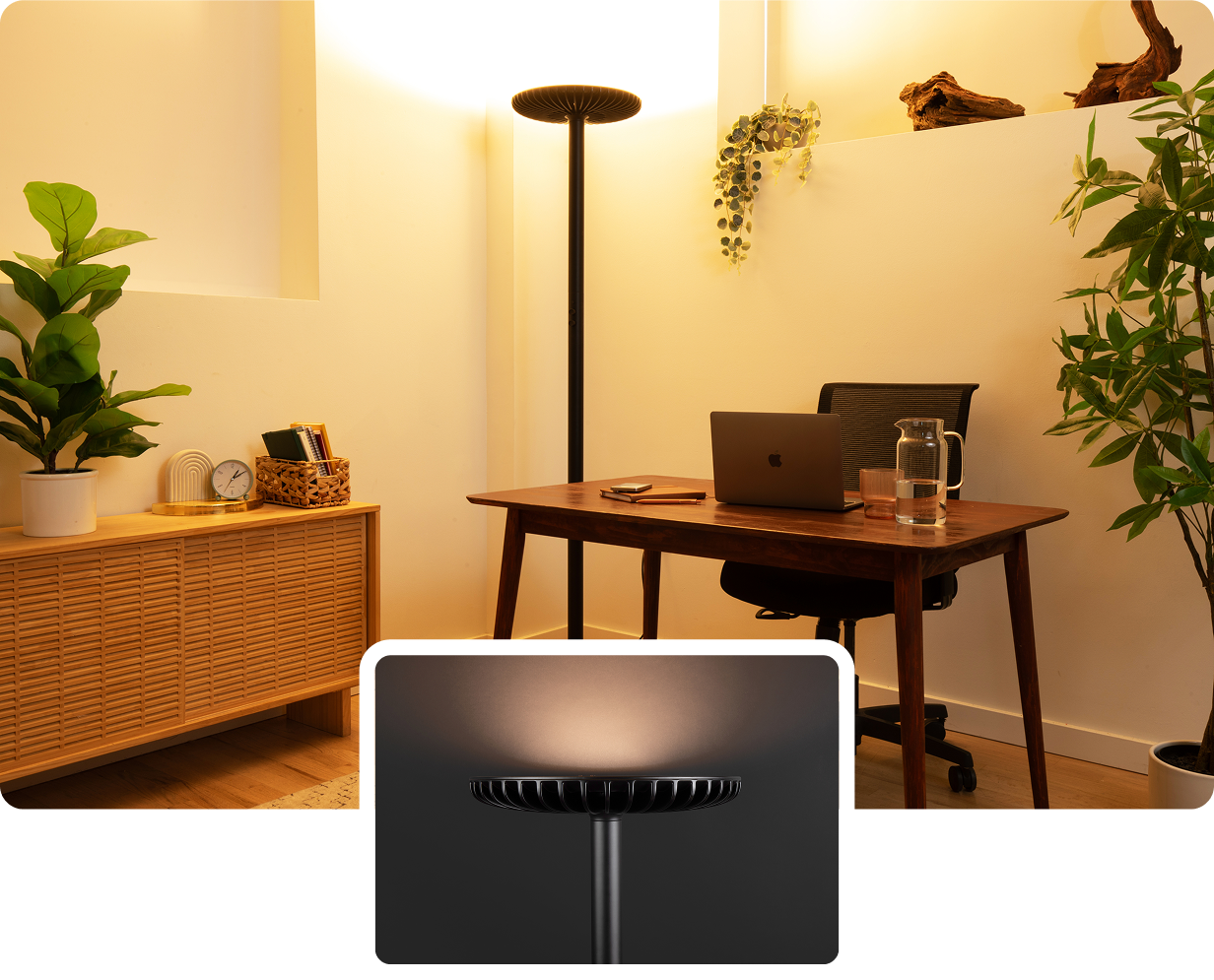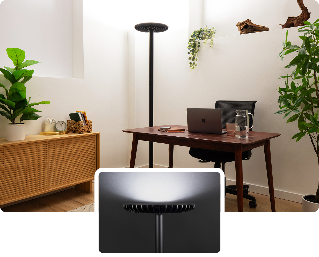 Brighter emits 60,000 lumens to simulate sunlight indoors with photography-grade LEDs that mimic the sun's spectrum to improve mental health & productivity. By signaling daytime to your brain, Brighter combats sleepiness, fatigue, and Seasonal Affective Disorder.